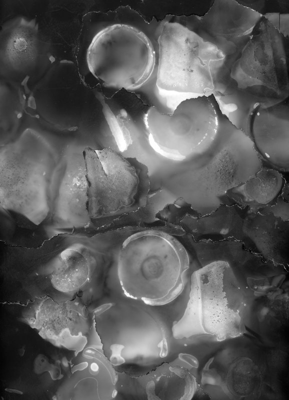 A collage made from photograms using roughened and rounded glass fragments collected from the mud and shingle of the Thames foreshore at Limehouse. I don’t know their age, they look perfectly ordinary to me, no lettering. The circles must be the bottoms of glass bottles. Nothing valuable, nothing like the treasures described in Ted Sandling’s book ‘London in Fragments’, but from that book I take this notion, in Iain Sinclair’s foreword: