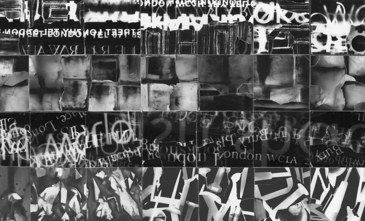 I’ve been working on images with long horizontal lines of small visual incidents packed closely together. The idea came, I think, from a trip to Japan a year ago, where I travelled on the bullet trains from, amongst other places, Hiroshima to Kyoto. The trains are so fast that the landscape/cityscape seems to speed past you in one continuous rush. The lettering on adverts moves too quickly to be deciphered, and I wouldn’t understand it anyway. The words in this image come from clear plastic bags printed with names of galleries or shops. When used for photograms, writing is superimposed on writing, words appear backwards, letters obscuring each other.